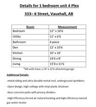 Great opportunity to own your own rental properties. Two 4 plexes. First 4 plex, built in 2015, has 4 - 1 bedroom units with large open kitchen, living, dining room, vaulted ceilings in a modern design, The units feature large laundry rooms with lots of extra storage space. Each of these units have an attached garage with entry into the house, no need to walk outside in poor weather. Large yards with room for gardens as well as partitioned private patios. Second 4 plex, built in 2022 has 4 - 2 bedroom units. This is a very nice property with modern open floor plans, large kitchens, living and dining rooms. These units also have attached garages, large yards and patios with privacy walls. Both units are located very close to amenities, shopping and schools as well as close proximity to the baseball diamond and rink. The attached vacant lot of approximately 2 acres leave additional development possibilities. THIS IS A RARE FIND AND OPPORTUNITY TO GROW YOUR OWN BUSINESS