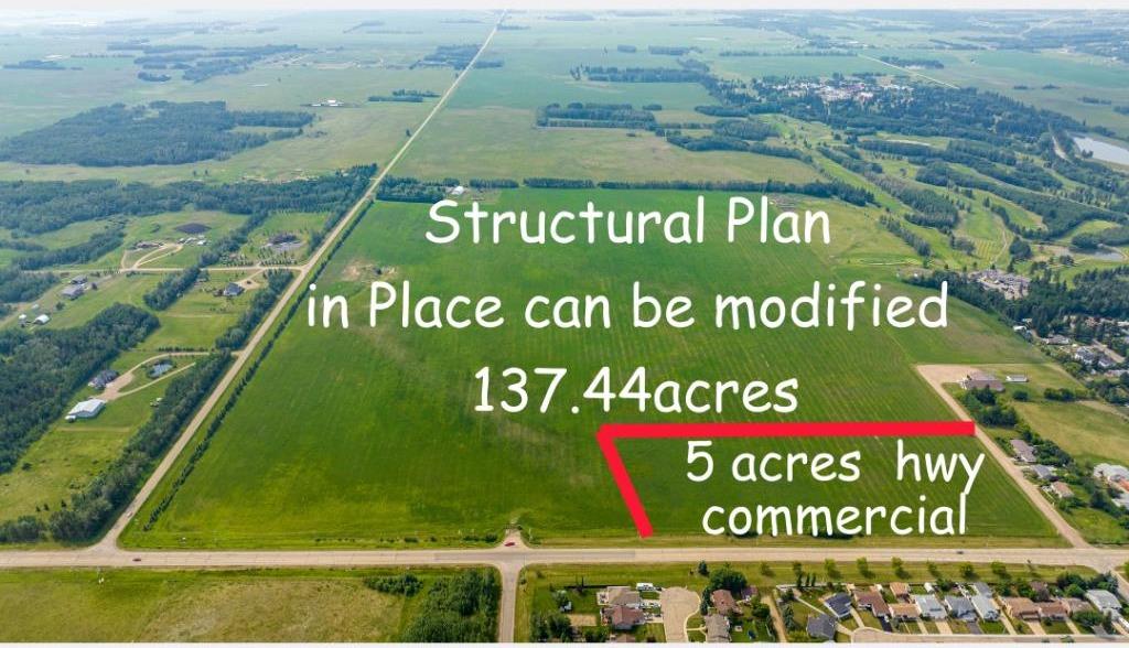 Looking for Prime Land for Farmland / Development / or Investment in Central Alberta just off Highway 2 in-between Calgary in Edmonton, This Is It! Exceptional 137.44-acre Development Parcel located on the South-East corner of Ponoka along Highway 53. This property has been annexed into the Town of Ponoka and includes a Structural Plan of 400 Single-Family Residential Lots, with possibilities for modifications for Multi-Family and Duplex Development and possibility of Senior Complex along side Single-Family Residence subject to Town Approval. 5 acres of land have been Designated Highway Commercial Development. The property offers Beautiful Views overlooking the Battle River Valley, potential Walkout Lots, and is lined with Mature Spruce Trees along the East boundary, creating a stunning Natural Backdrop and adding value for a Future Subdivision. The West side backs onto the Ponoka Golf Course, further enhancing the appeal for Residential Development. Ideally located with Quick Access to Highway 2, providing Convenient Travel to Red Deer, Edmonton, the University of Alberta, and Edmonton International Airport. This property is centrally located for easy access to all major racetracks which is a multi million dollar industry in Alberta. [ Alberta is home to 37% of all horses in Canada ]. Ponoka has Two Local Hospitals, one is a Major Brain Injury Hospital and Mental Health Centre in Alberta, plus this property location has access to a min of 25 hospitals in Central Alberta within an hour drive for anyone in the Medical Profession looking for Local Employment Opportunities or Development. And let us not forget the annual Tourist Attraction, “The Ponoka Stampede”; the second largest Pro Rodeo and World Professional Chuckwagon Races in Canada!! Recent expansion of the Local Airport makes it a Vibrant and Growing Community in Central Alberta. The land is currently producing hay (approx. 598 bales annually), and the seller is willing to rent back the farmland until development begins, offering Interim Income Potential. An additional 5.4-acre acreage with a High-End Two-Storey home, double attached garage, covered veranda, and Quonset is available for purchase separately or together with the bare land making this an Outstanding Package of land to own or create your own Yellowstone Ranch. Municipal water and sewer services are located at the Northwest corner of the property, supporting Future Development. A Rare Opportunity to secure a Large-Scale Development parcel in one of Central Alberta’s most Desirable and Strategically Located communities. Check supplements for Development Plan, Title and Video.