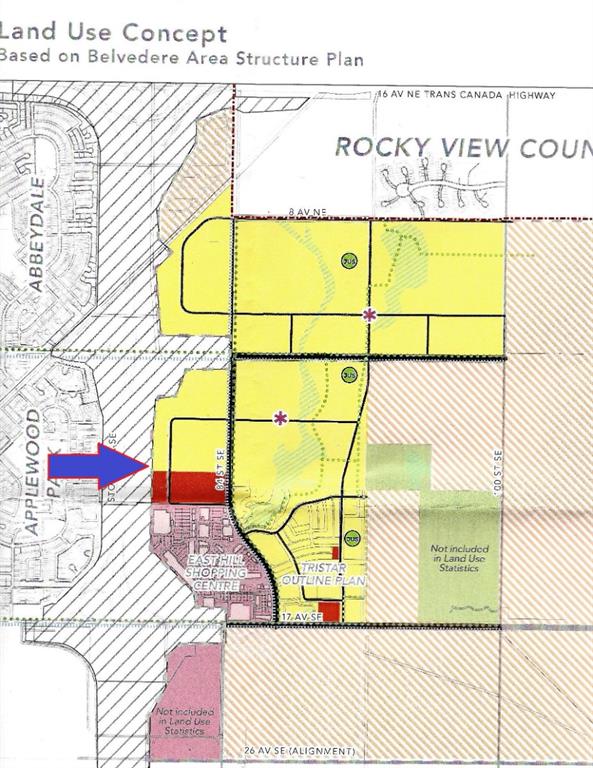 Calgary Belvedere 13.52 Acres Adjacent to East Hills Retail + Costco w/Stoney Trail Frontage. This prime piece of land is centrally located immediately north of East Hills Costco and the RioCan East Hills Shopping Centre and immediately adjacent to new development proposal (133 acres). Lots of growth underway in Belvedere with TriStar Communities Belvedere Rise, Minto East Hills and Genesis Huxley residential neighborhoods well underway, and the Memorial Drive Extension is coming soon. 13.52 Acres at $750,00/acre (12.26 acres with adjoining 1.26 acres) in Belvedere ASP with 2,000+ foot frontage to busy Stoney Trail Freeway. Services are nearby. Transit to downtown via Calgary Transit's MAX Purple rapid transit bus route service at East Hills Retail (across street from subject land). This 13.52 acre property is immediately north of the RioCan East Hills Calgary retail development which is located at 17th Avenue SE and Stoney Trail and includes major retailers Costco, Walmart, Cineplex, Marshalls, PetSmart, Michaels, Staples and many others under construction. The 13.52 acre property is currently S-FUD. Primarily Land Value (modular home has structural issues). Excellent elevated panoramic south and west mountain and city views. Tenant occupied with cell tower and tenant income, access by appointment only.