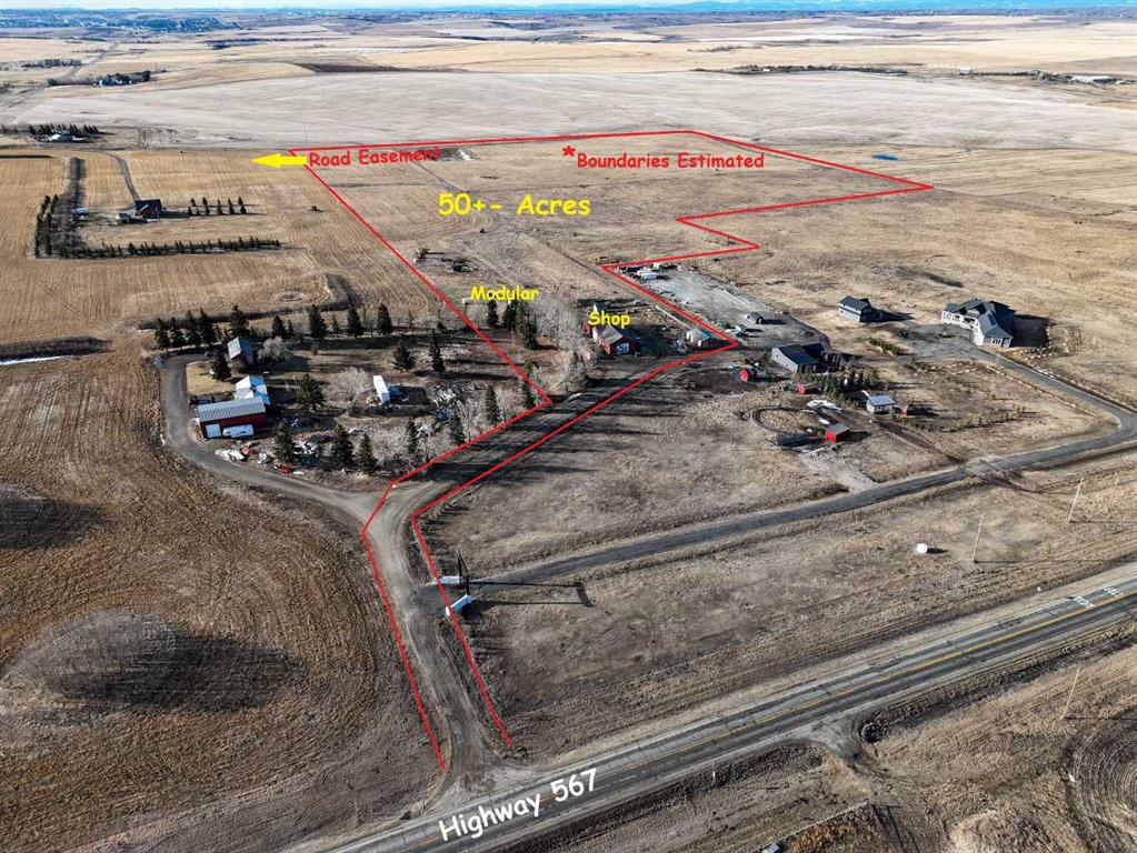 First time offered!! 50 acre opportunity property located at intersection of Symons Valley Road and HWY 567 (Big Hill Springs Road), straight west of Airdrie. Unbeatable mountain views, slightly rolling terrain, and convenience of paved road to the driveway. 1040 sq.ft. , 2 bedroom, 2 bathroom, fully serviced Modular home on site (could be sold and moved, with new home built to replace it). 105' x 35' 3-section shop plus another 23' x 38' storage building. Fenced and cross-fenced.. Approximately 15 minutes to Airdrie, 10 minutes to North Calgary, and 25 minutes to Calgary International Airport. Site is zoned A-SML,, but location would suggest future property development opportunities, with existing road easement to Symons Valley Road. Approximately 4-acre lease generates $4,500/year revenue for the property. Planted grazing lands are organic, with no applied chemicals for past 20 years. Multiple walk-out building sites with unrestricted mountain views Available with short notice!